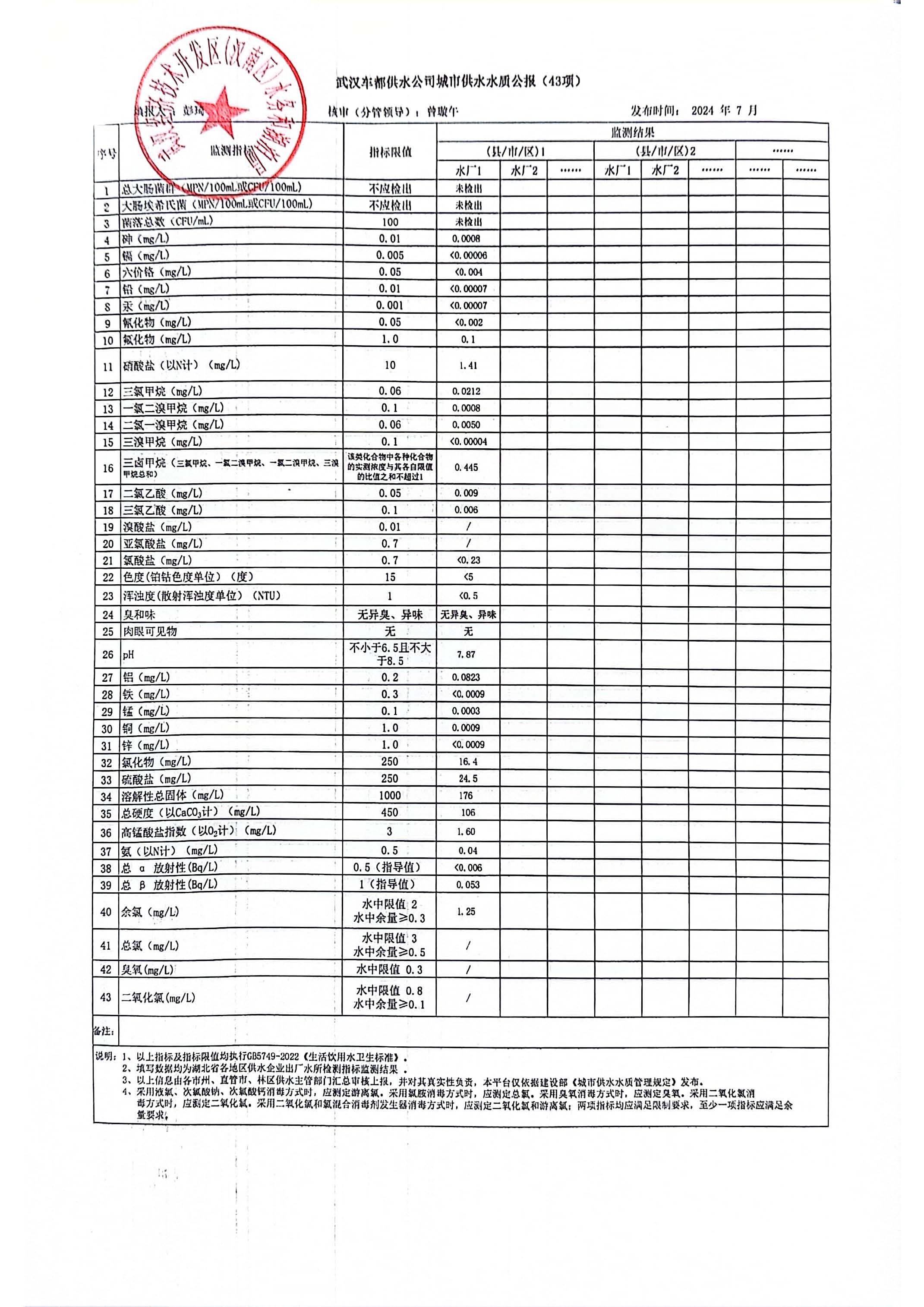武汉经济技术开发区(汉南区)2024年7月城市供水水质公报