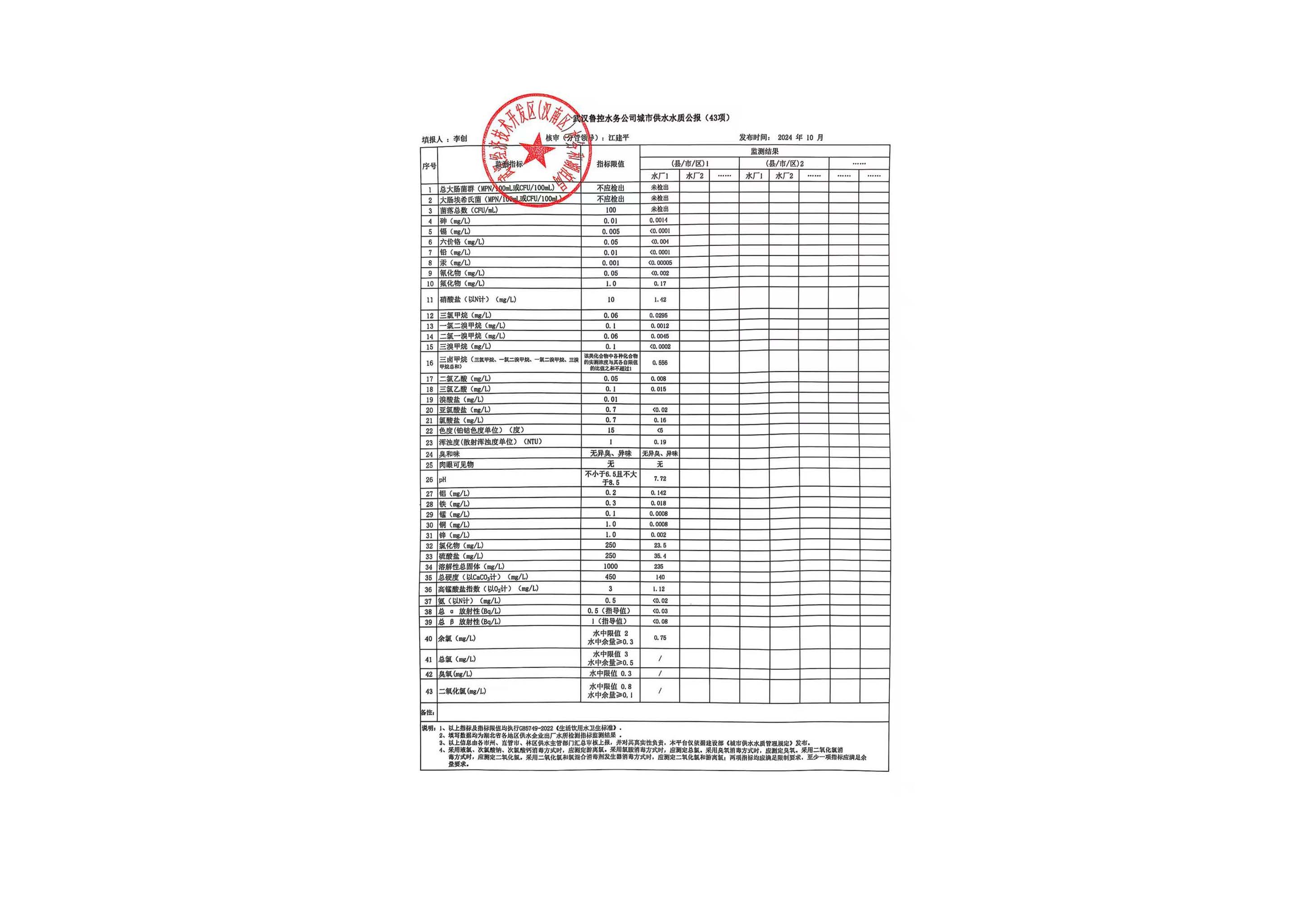 武汉经济技术开发区(汉南区)2024年10月城市供水水质公报