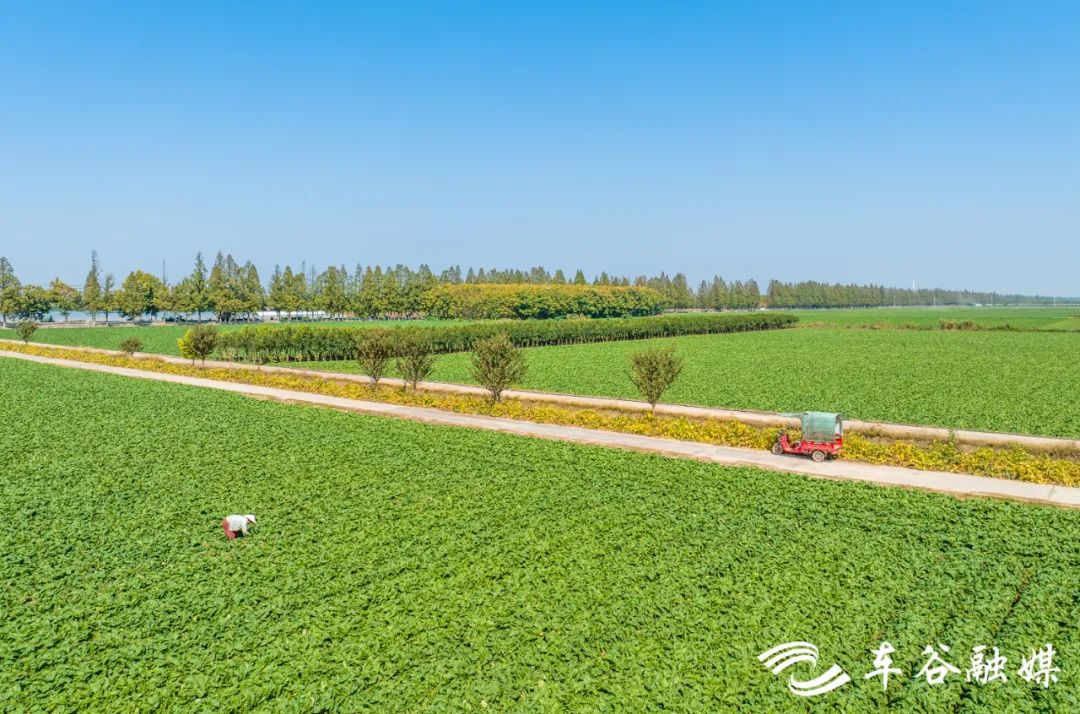 穿过一片村居房舍,眼前出现一大片菜地。菜垄齐齐整整,绿意从脚下向田野的尽头铺展开去。路的另一侧,满目金黄,对比鲜明。