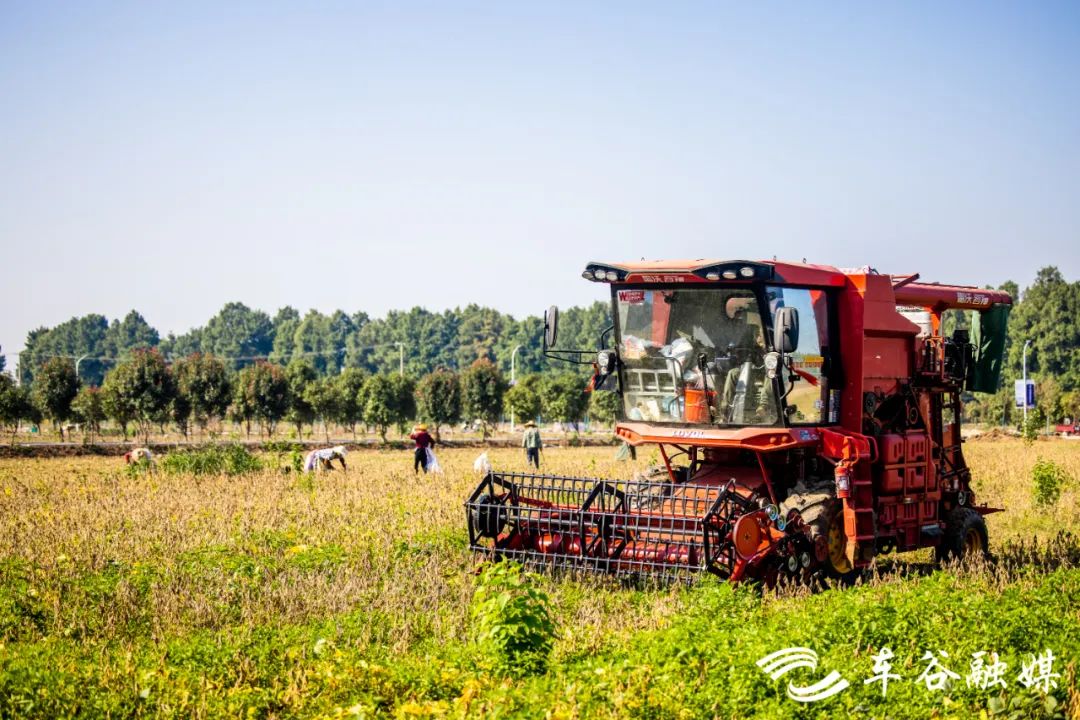耳边传来收割机作业的隆隆声。哦,这里的大豆也正在收获。金黄,是这片土地的主色调。