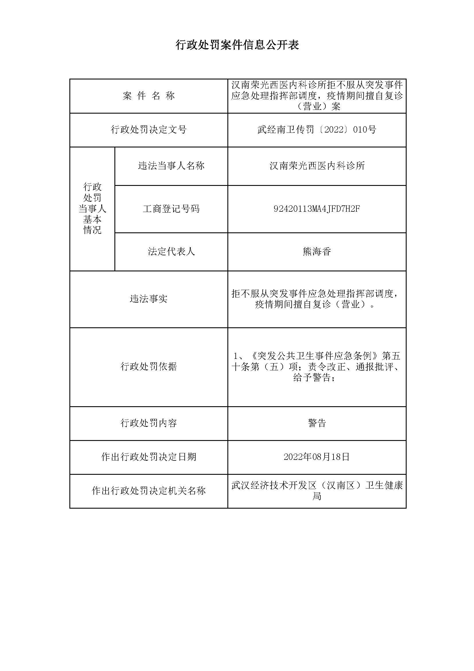 行政处罚案件信息公开表(汉南荣光西医内科诊所)