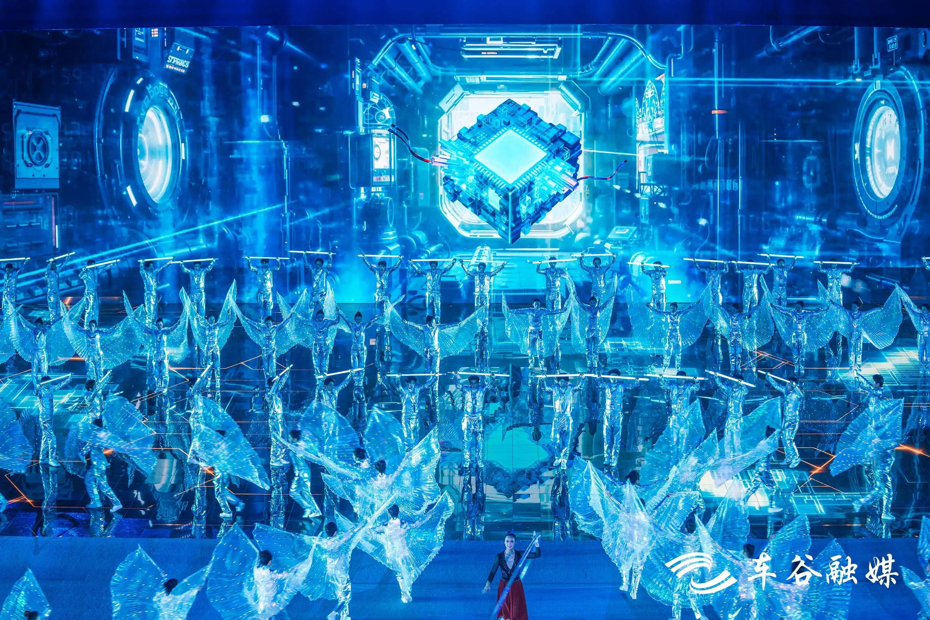 舞台大屏上,光影交织间,江水奔涌、机械齿轮转动,层次丰富、动感十足,与演员们灵活变换的队形相得益彰。智能汽车巡游、全息投影、AI视频技术和立体LED屏幕系统广泛运用,“未来感”十足。