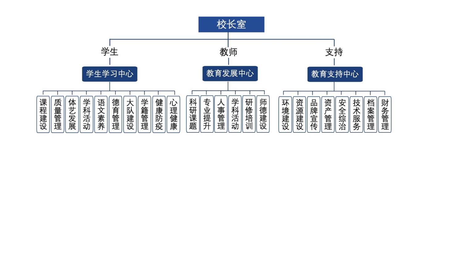 神龙小学以校长室为学校职能核心,下设学生学习中心、教师发展中心、教育支持中心,各中心职能分别如下: