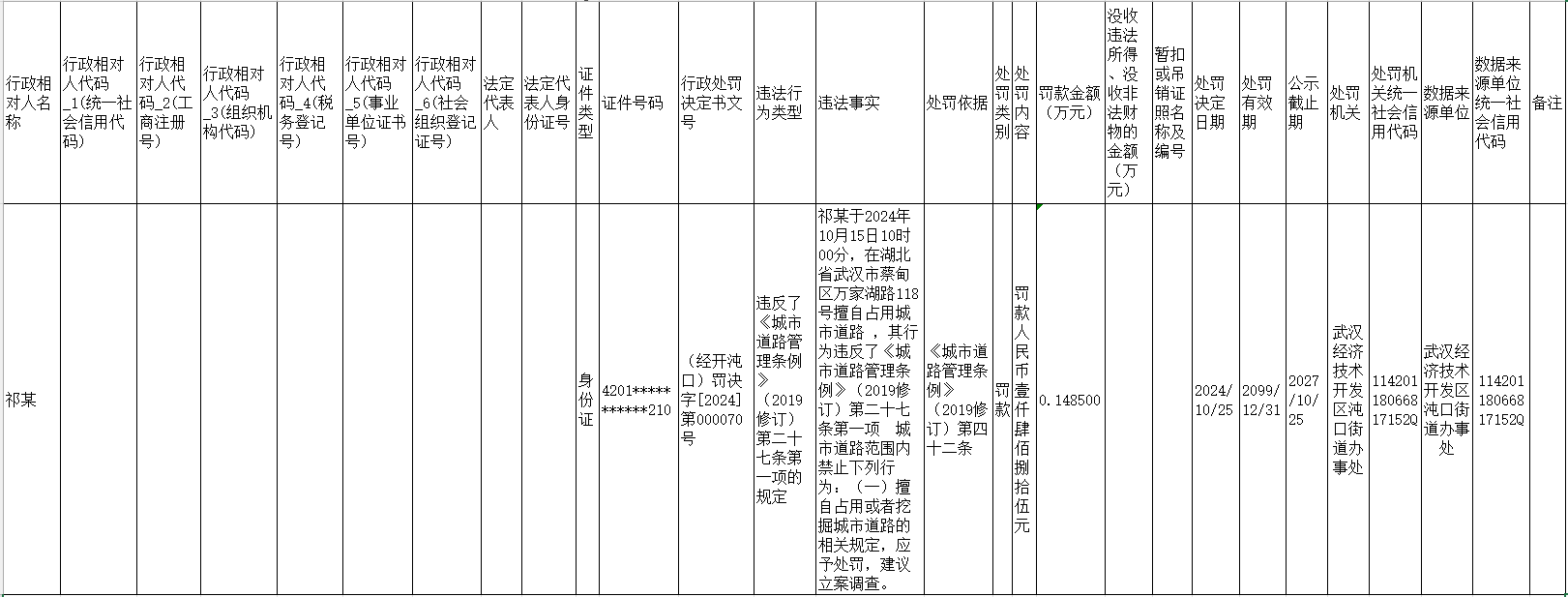 违反了《城市道路管理条例》的处罚(祁某)