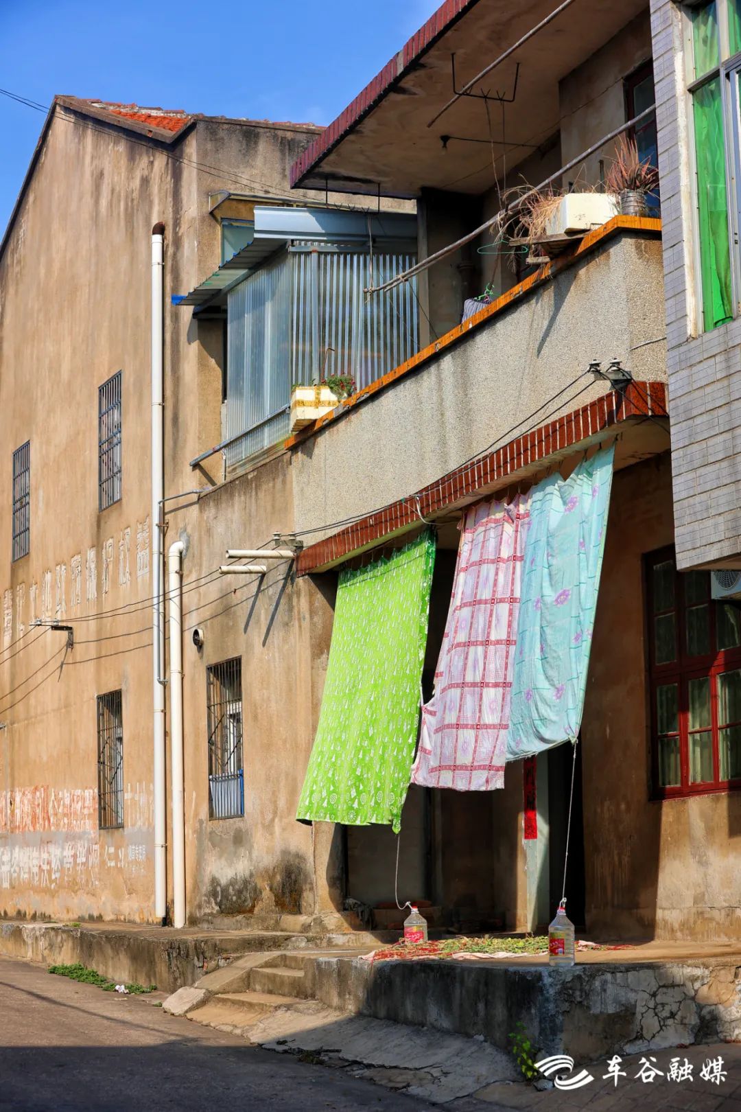 用床单做成的防晒檐,下面挂两个小瓶子防止吹落,风轻轻拂过,瓶子悠悠地晃动。一只晃悠悠的老藤椅,一把旧旧的蒲扇,一床斑驳的竹席,仿佛看见自己儿时在外婆家,吃着从井里刚捞出的“冰镇”西瓜,恣意玩耍,累了往竹席上一躺,然后被外婆手中一摇一摇的蒲扇送入梦乡。