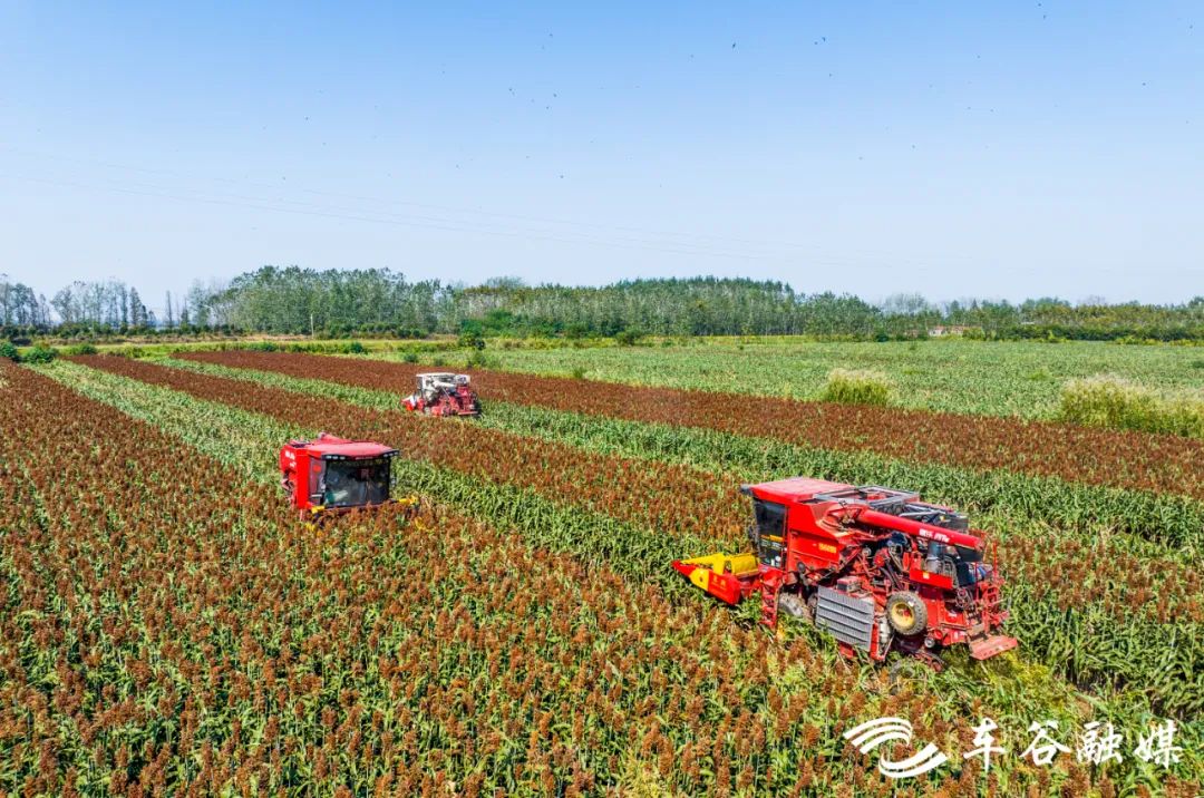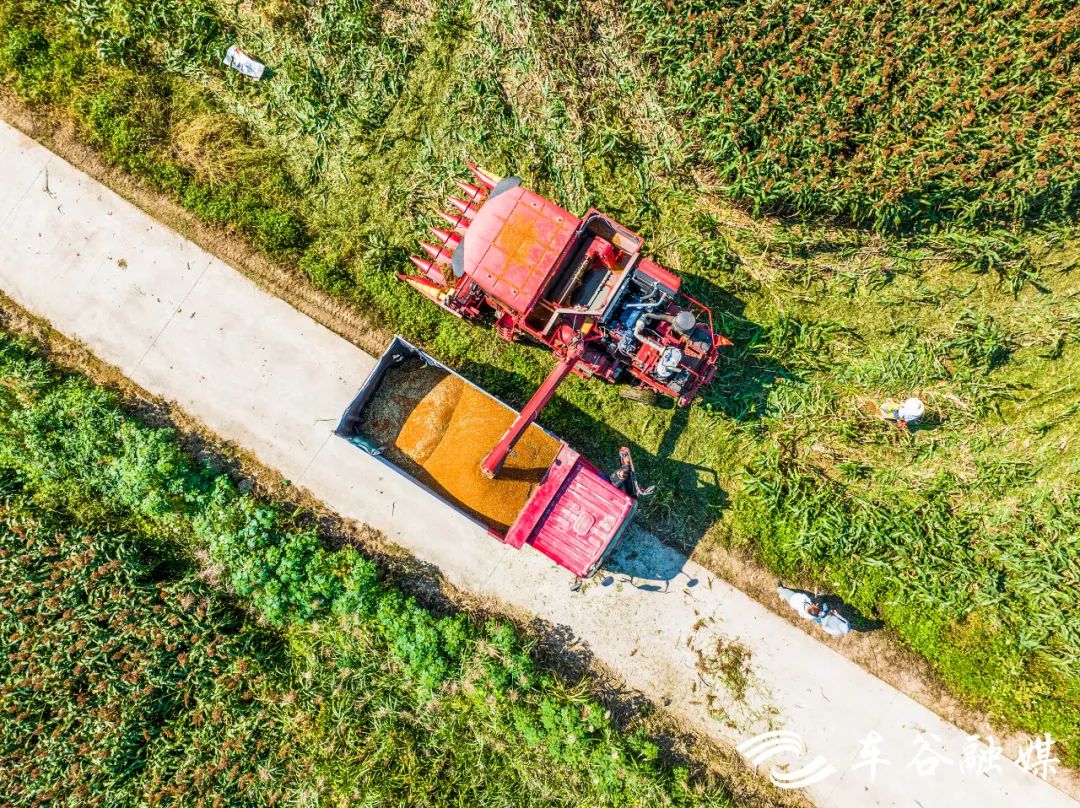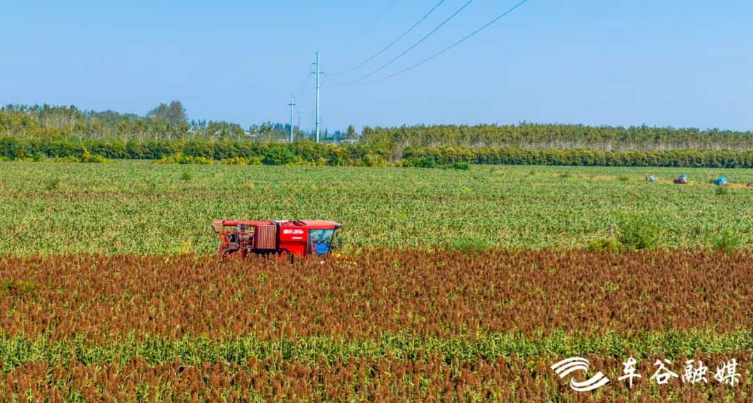 眼前的丰收场景,让这片高粱地的主人嘴角微扬。他说,这片高粱有2000亩,耕种管收全程机械化,亩产可达850斤。在不远处,他还有300亩大豆,也正在机械收割。