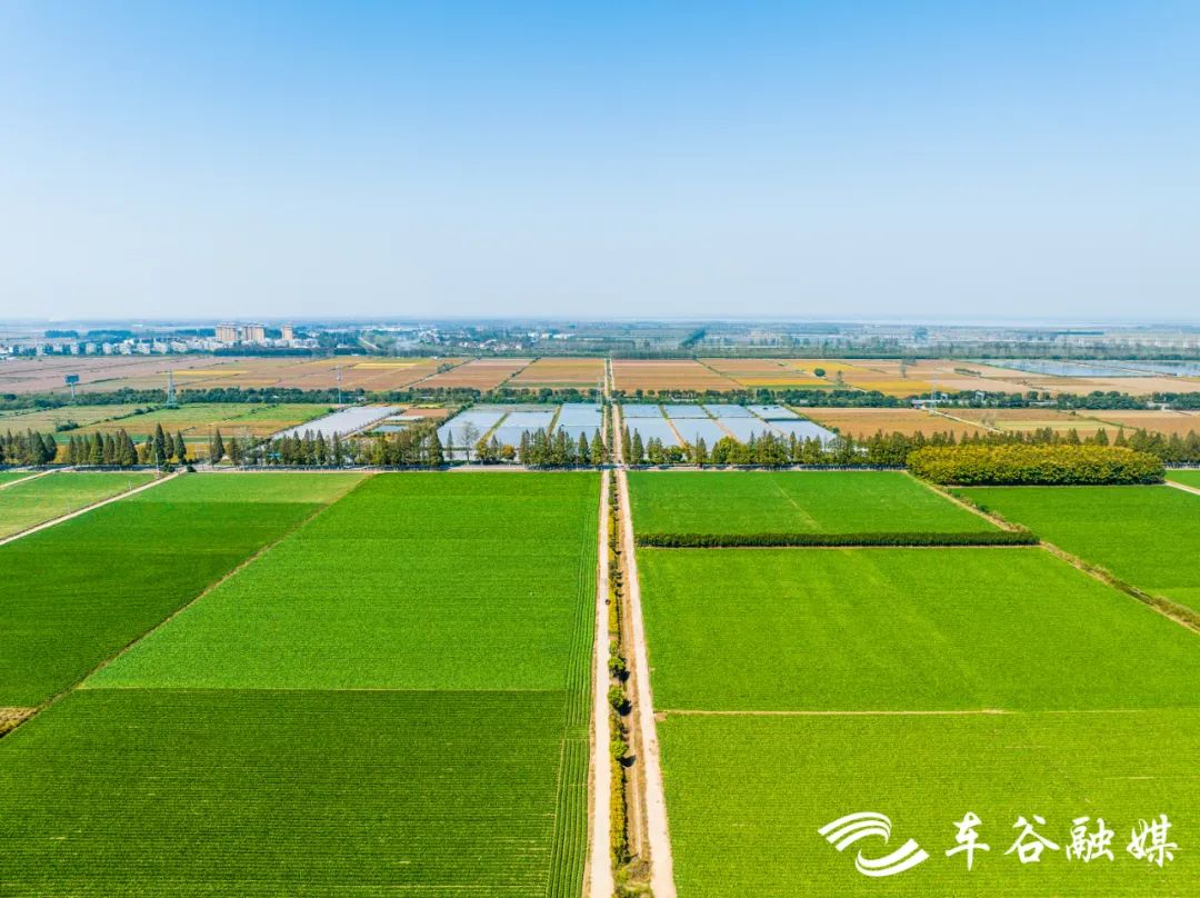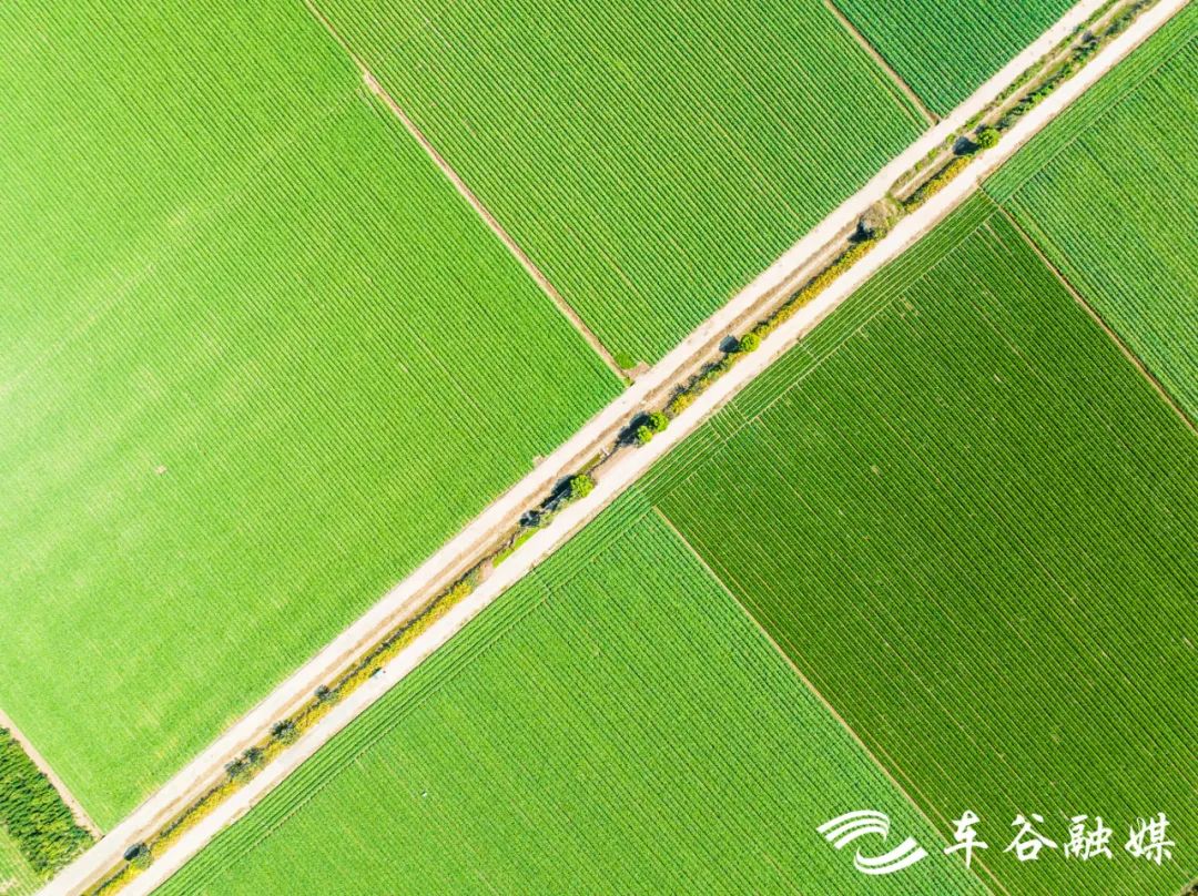 穿过一片村居房舍,眼前出现一大片菜地。菜垄齐齐整整,绿意从脚下向田野的尽头铺展开去。路的另一侧,满目金黄,对比鲜明。