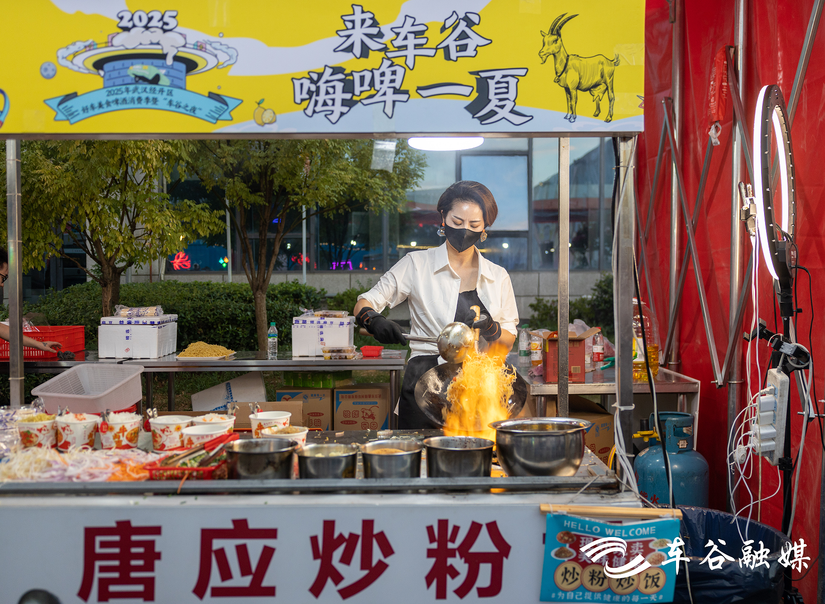 60余家本土美食摊位前烟火升腾,热干面、烤串、小龙虾等特色小吃香气四溢,市民们大快朵颐,畅享夏夜美味。网红“炒粉姐”的摊前早早排起长队,锅铲与锅底碰撞间,烟火味缭绕升起,“未来三天我都会在这里炒粉,欢迎大家来找我吃粉”,“炒粉姐”说道。