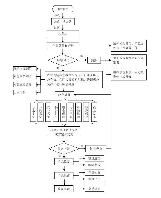 (8)区交通大队:负责组织指挥轨道交通运营突发事件现场区域及周边道路的交通管制、分流、疏导以及临时交通管制信息的发布,维护现场及其周边交通秩序,确保抢险通道畅通。