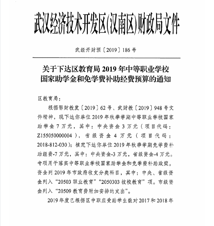 关于下达区教育局2019年中等职业学校国家助学金和免学费补助经费