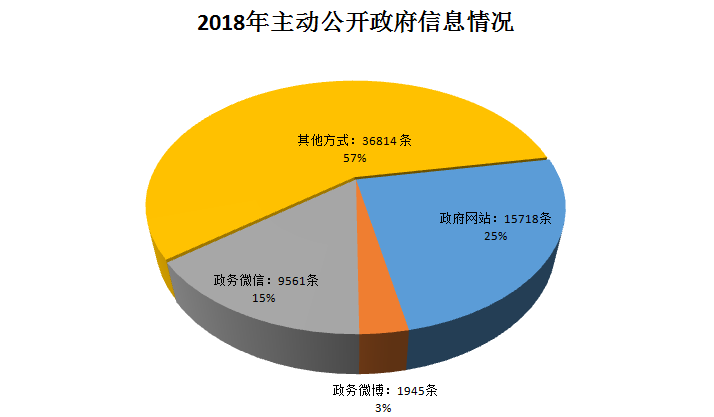 2018年,我区各责任部门和单位依法向社会主动公开的政府信息共计64093条,较上年增长32%。其中通过政府网站公开15718条,通过政务微博公开1945条,通过政务微信公开9561条,通过其他途径公开36814条。